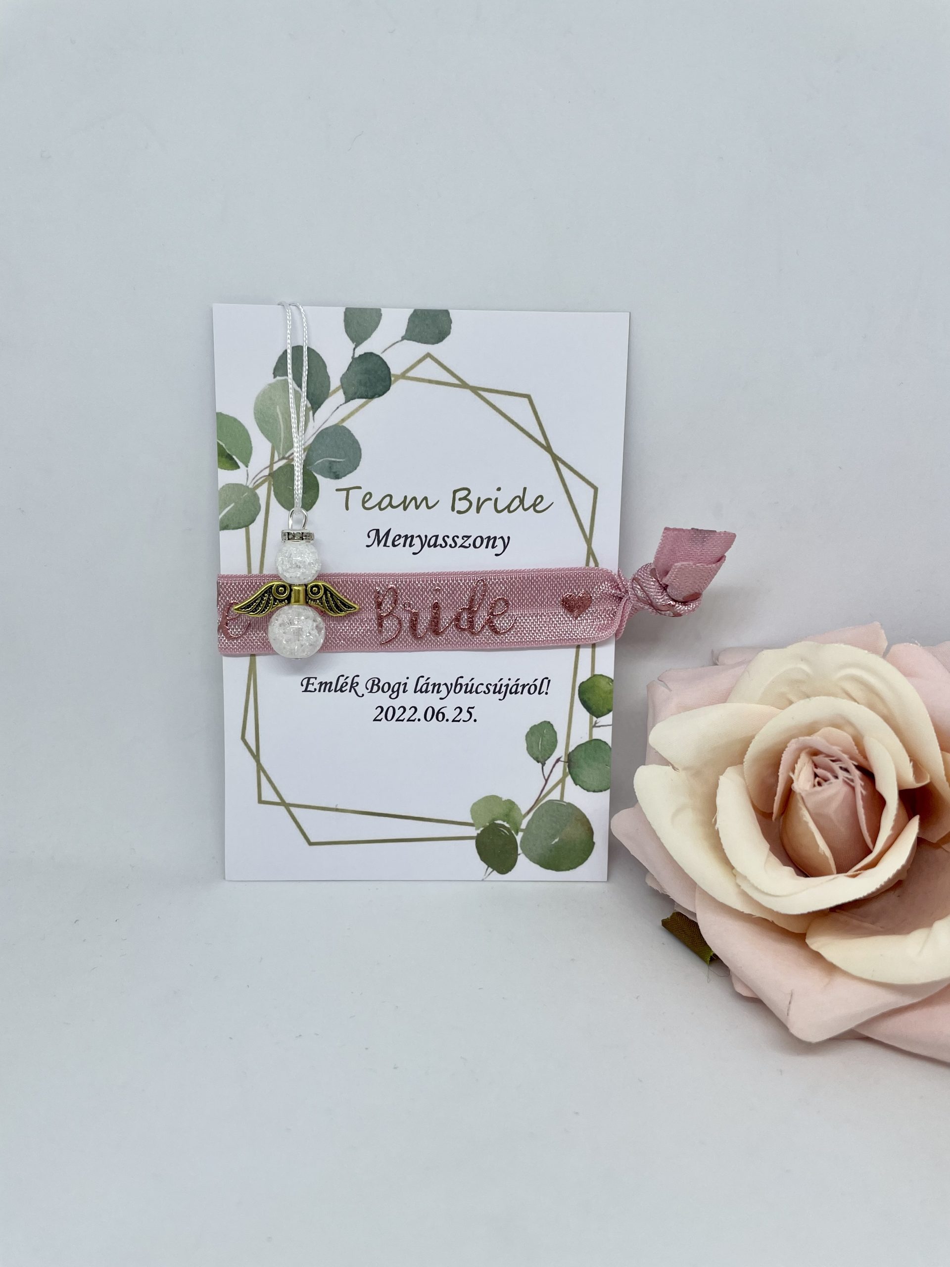 Különleges lánybúcsús ajándék a menyasszonynak. Rózsaszín alapon rose gold „BRIDE” felirattal és roppantott hegyikristály angyalkával kiegészítve.