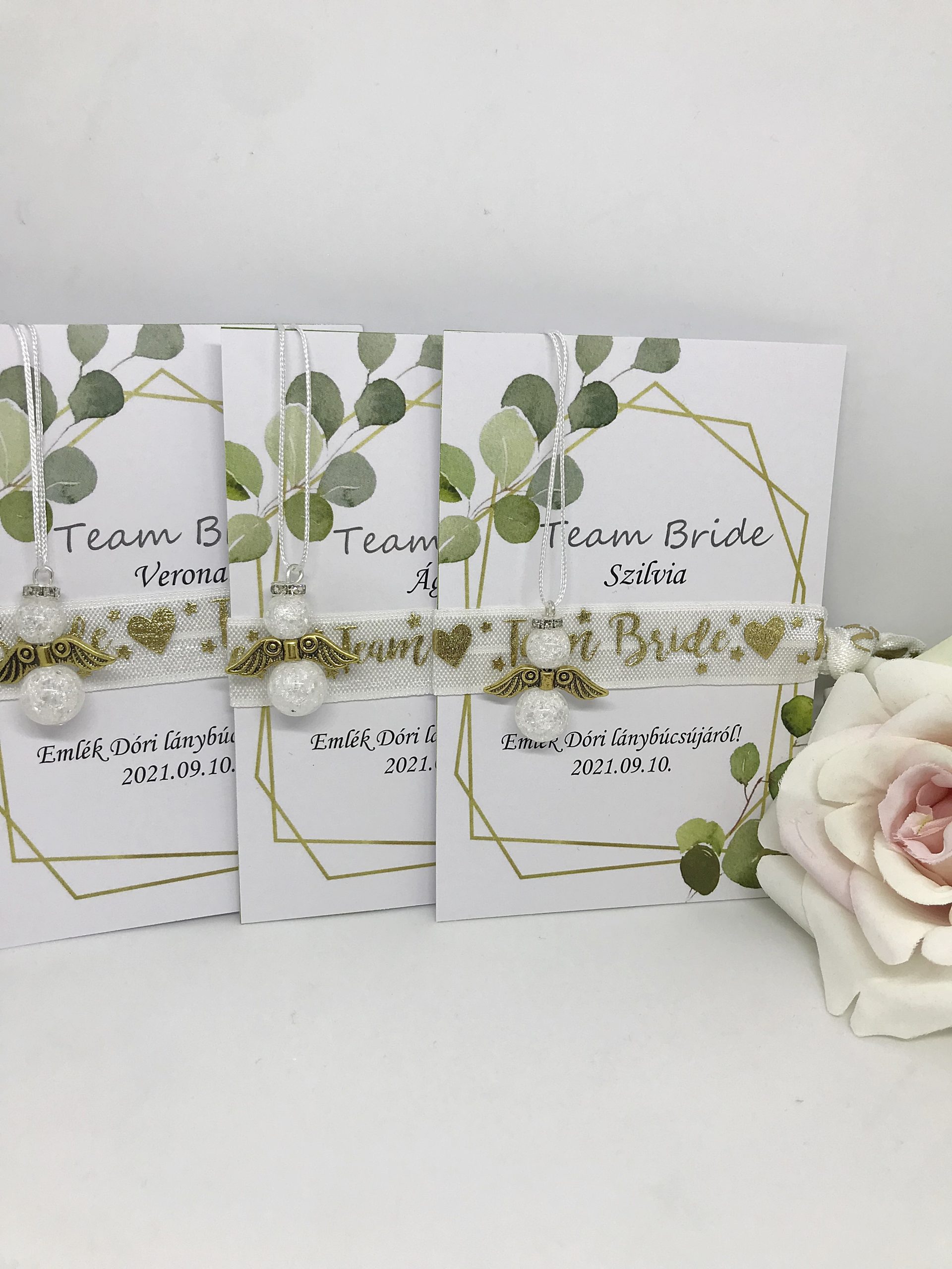 Különleges lánybúcsús ajándékszett, arany „Team Bride” felirattal, valamint roppantott hegyikristály, arany szárnyas angyallal.