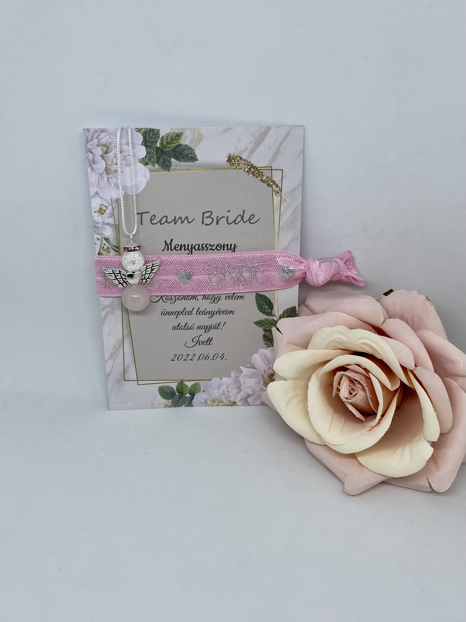 Különleges lánybúcsús ajándék menyasszonynak, rózsaszín szalag ezüst „BRIDE” felirattal, hegyikristály és rózsakvarc angyalkával kiegészítve.