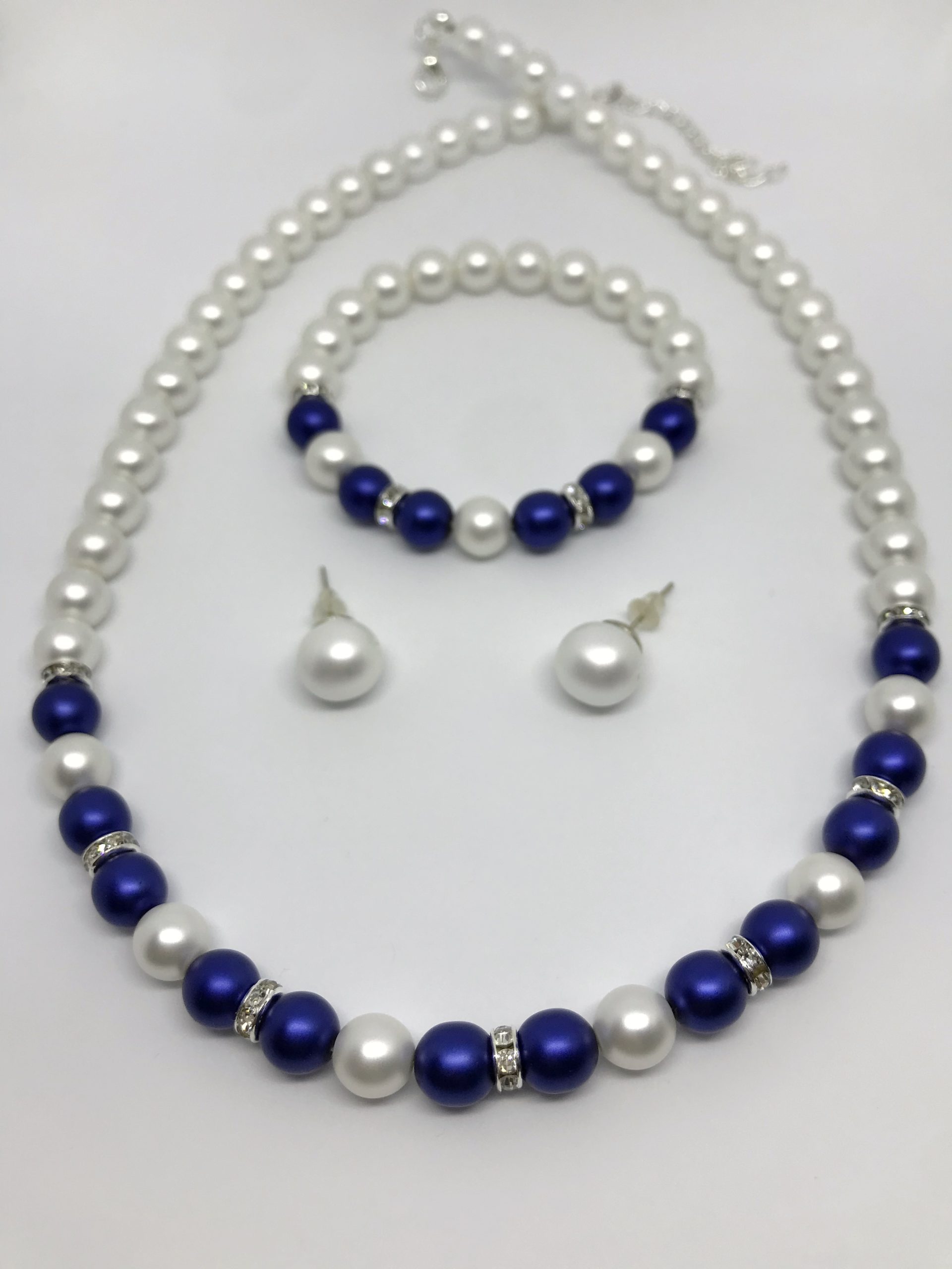 Egyedi desing alapján készült menyasszonyi ékszer szett, indigókék és matt fehér akril gyöngyből és bedugós fülbevalóval.