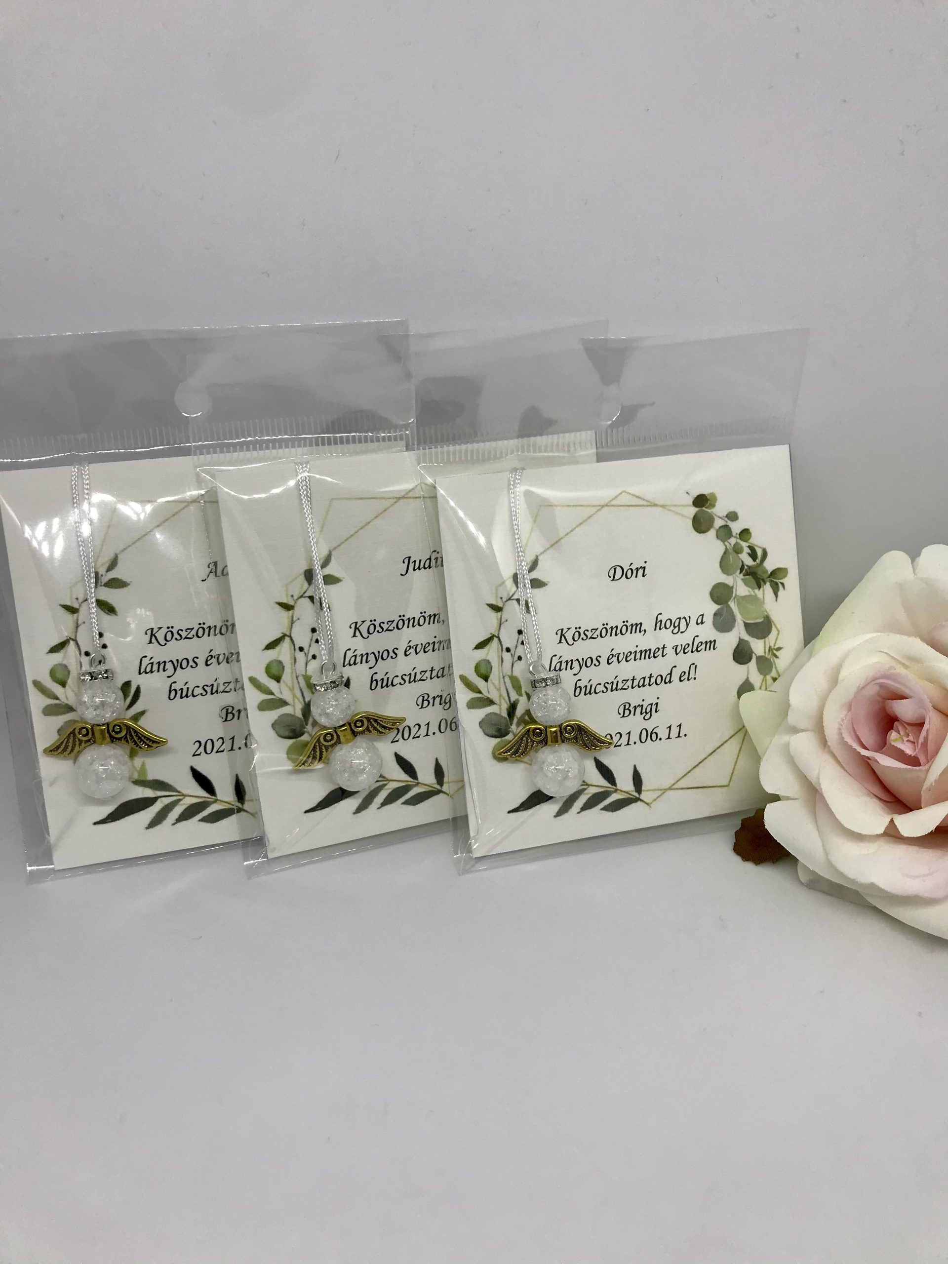 Egyedi elképzelés alapján készített lánybúcsús ajándékok, roppantott hegyikristályból arany angyalszárnnyal.