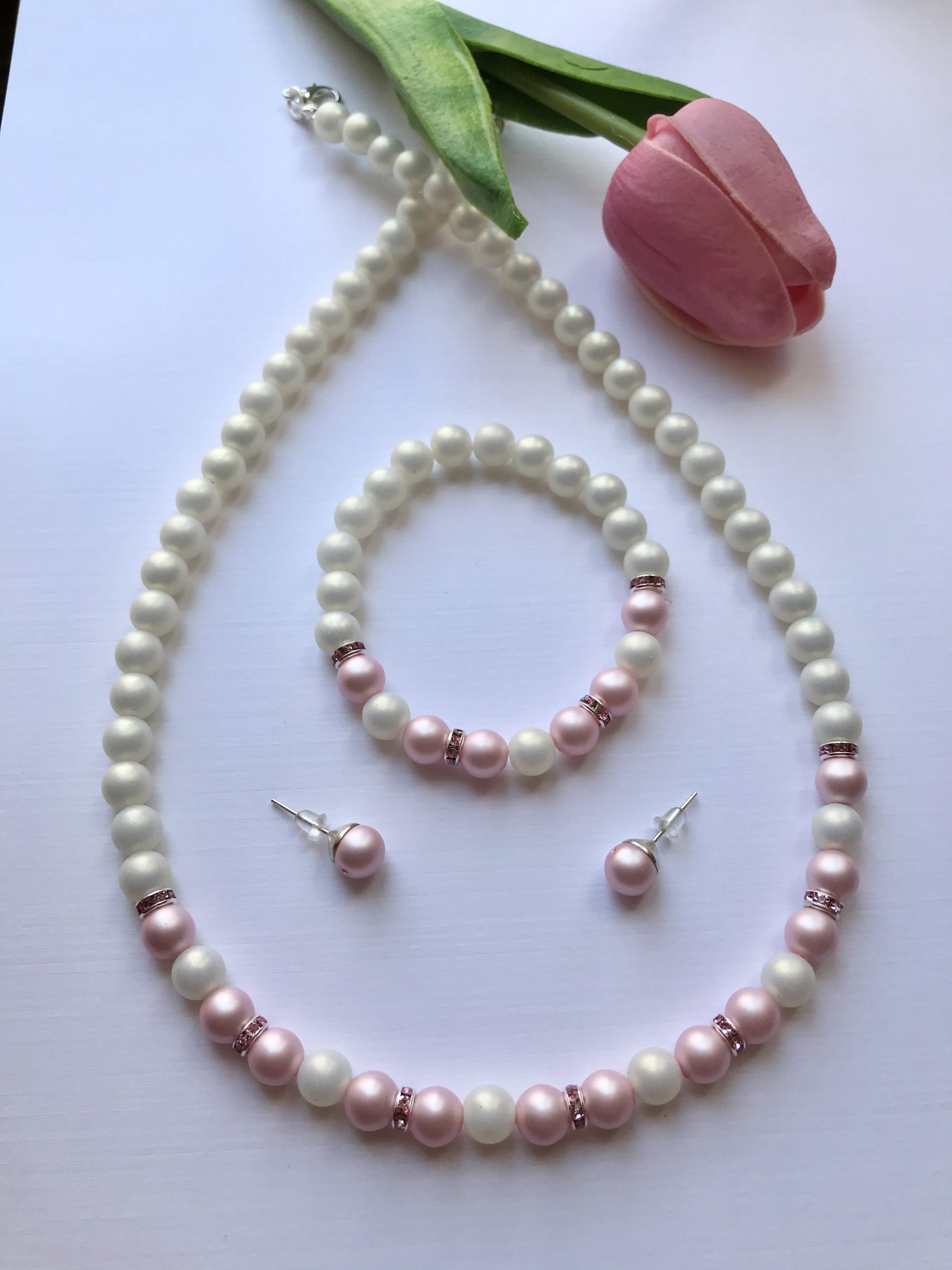 Egyedi desing alapján készült rózsaszín és fehér akril gyönygyből álló menyasszonyi szett.