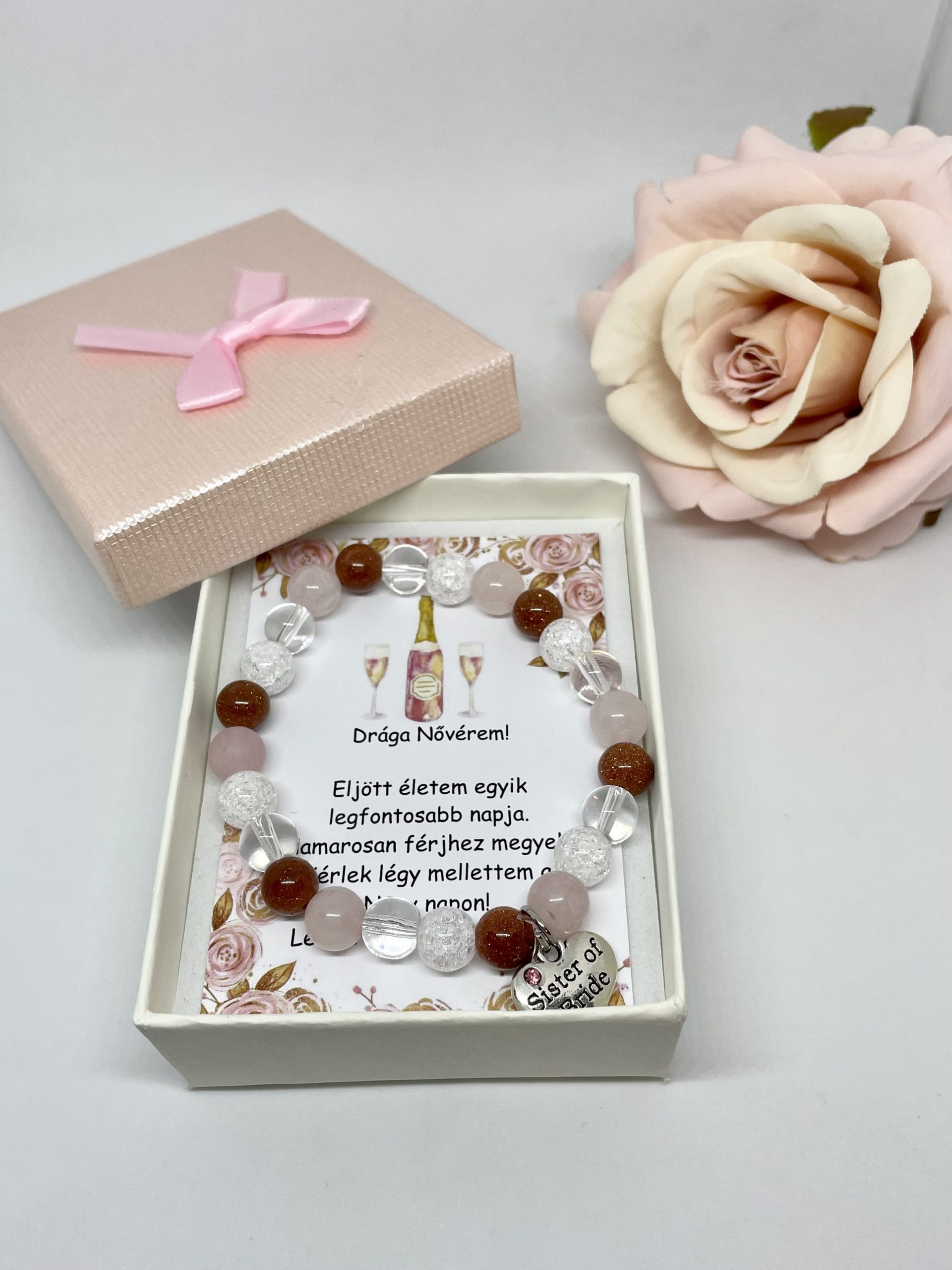 Rózsakvarc: A rózsakvarc, a feltétel nélküli szeretet és a végtelen béke köve. Termékenységfokozó, nyugtató, kommunikációt erősítő, méregtelenítő, vesejavító, vérnyomás stabilizáló és bőrregeneráló. Figyelem! Viselés hatására elszürkülhet, kifehéredhet.