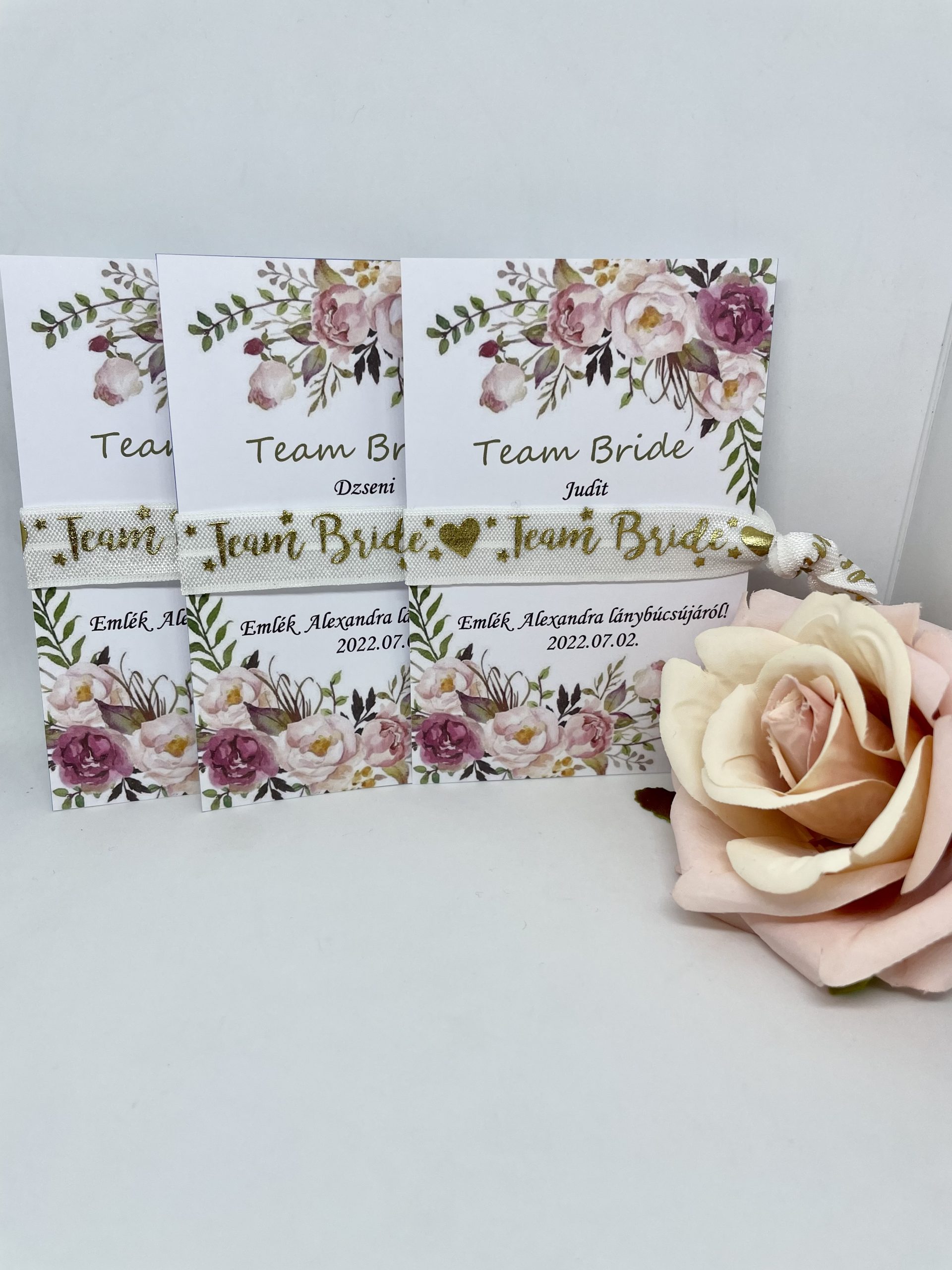 Különleges lánybúcsús ajándék, fehér szalag arany „TEAM BRIDE” felirattal, virágos kártyával.